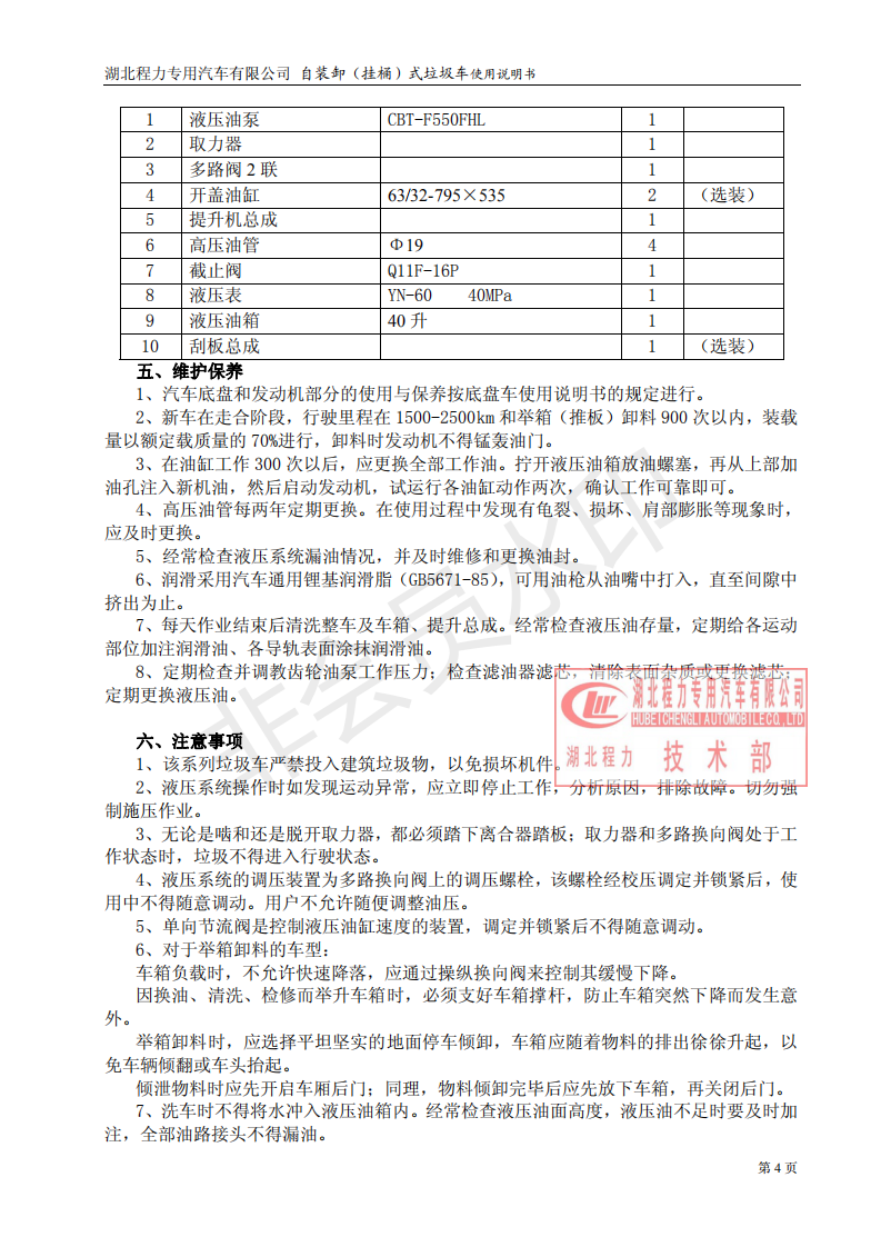 湖北程力自裝卸式垃圾車(掛桶式垃圾車)使用說明書